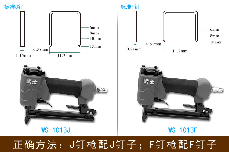 所以,因?yàn)?ldquo;J釘要比F釘寬”,1010J的釘子,只能用在1013J氣釘槍;1010F的釘子,也只能用在1010F或1013F氣釘槍上。我們?cè)谫徺I釘子時(shí),應(yīng)該是買“J釘配J氣釘槍;F釘配F氣釘槍”,千萬別混用了。