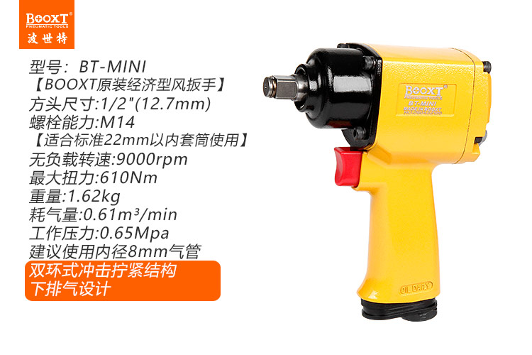 您當(dāng)前的位置: 首頁 > BOOXT產(chǎn)品中心 > 氣動扳手 > 槍式氣動扳手-中大 > 迷你氣動扳手BT-MINI
