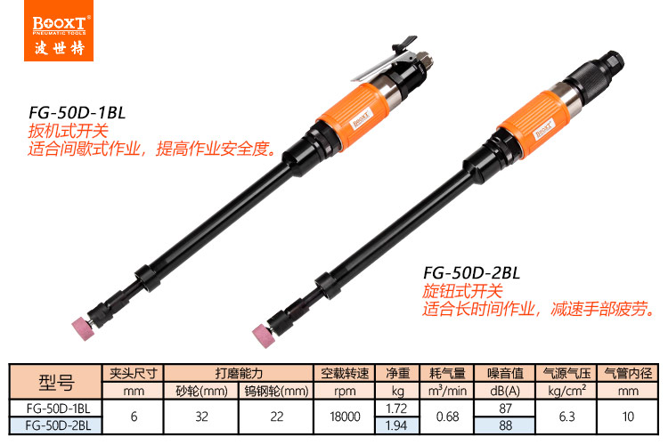 東莞市強勁五金工具有限公司提供臺灣BOOXT波世特品牌氣動工具,加長氣動風磨機FG-50D-1BL廠家直銷,首件享特價。咨詢熱線:4008301980