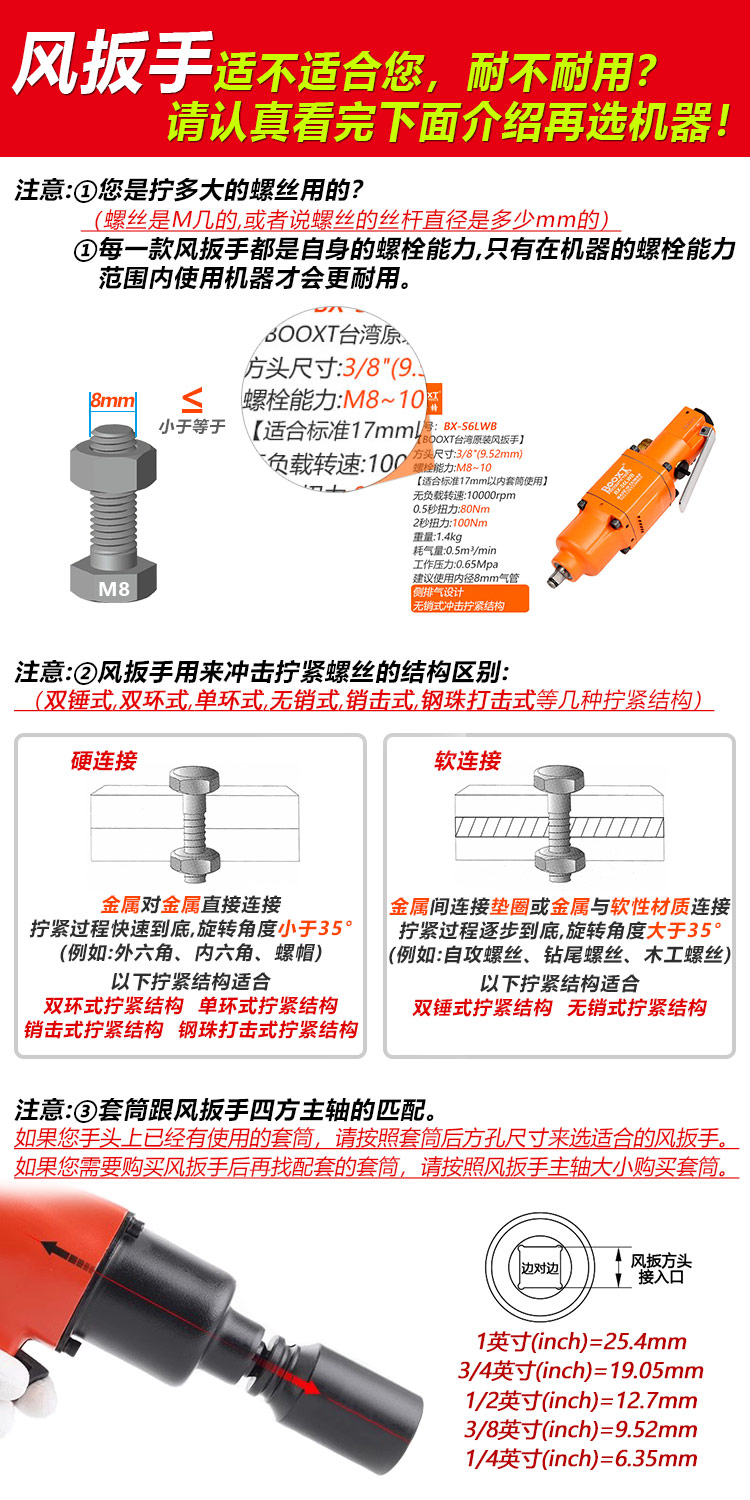 提示:因?yàn)椴煌圃旃S的測試標(biāo)準(zhǔn)不一樣,所測的扭力參數(shù)會(huì)相差比較大,另外測試扭力并不是實(shí)際螺栓擰緊的扭力(經(jīng)常有客人用這個(gè)扭力參數(shù)來選型是錯(cuò)誤的),建議沖擊式的工具選型請按“螺栓能力”來選,才是專業(yè)的。