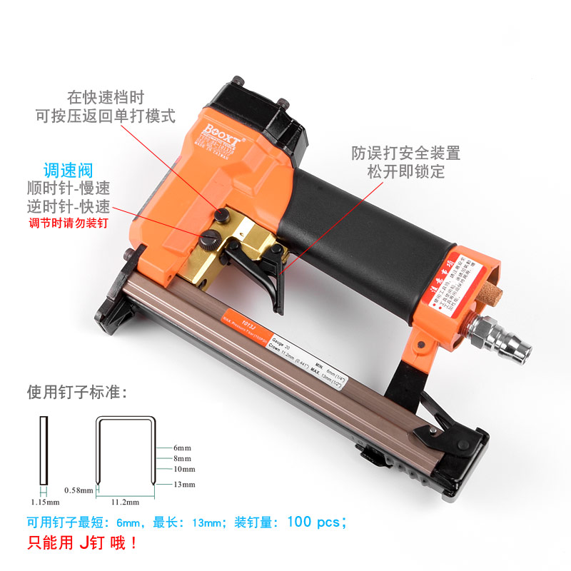 • 產(chǎn)品參數(shù): 特點:可調(diào)節(jié)快速連打,自帶防誤打安全開關(guān);釘子寬度:11.2mm;釘子跨度:10mm;釘腳尺寸:0.58×1.15mm;使用釘子長度范圍:6-13mm;裝釘量:100個;使用工作氣壓:0.6Mpa;推薦使用內(nèi)徑6.5mm氣管;平時多注意定時排放空壓機水份